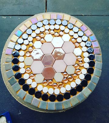 My garden is progressing nicely in the last few months since I have been home to tend to all her needs. Daily I am out there moving things around, pruning, pulling weeds, filling bins with dead debris, and generally tinkering about to achieve garden perfection. A rare thing to achieve as the next day there always seems to be something else to do! I have recently planted some sunflower seeds, many blue salvias, and a new pink wisteria, among other things. I wanted to create balance on the back patio, hoping the new pink wisteria will climb and kiss the purple one to the right. Then they can become a blended pair and drip cascades of blush pink and bright purples, for at least the brief season of flowering. I traded out some of the furniture on the patio too, and now have two comfy green velvet armchairs from which I can admire the garden in all its glory. I have also been busy with some mosaics, embellishing some of my pavers, my bird bath and a few other things. I love coloured tiles, and have become quite obsessed of late collecting as many beautiful tiles as I can.